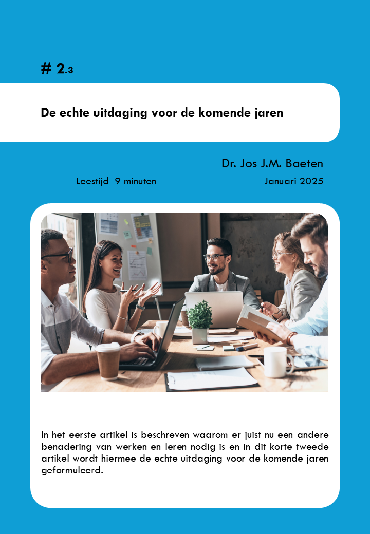 In een serie artikelen vertaalt dr. Jos J.M. Baeten, zijn ervaringen, inzichten en onderzoeken naar werkplekleren en AI, naar een nieuwe visie, perspectief en uitvoering van leren in organisaties: