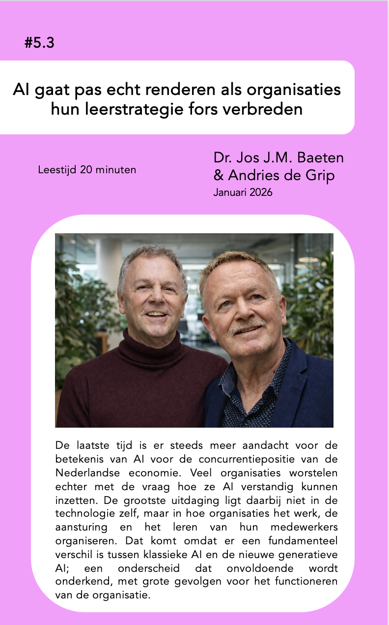 De nieuwe paper 'AI gaat pas echt renderen als organisaties hun leerstrategie fors verbreden' van dr. J. Baeten en prof. A. de Grip laat zien waarom veel AI-initiatieven in organisaties nog onvoldoende effect sorteren. Niet omdat de technologie tekortschiet, maar omdat organisaties blijven vasthouden aan een klassieke opleidings- en aansturingslogica die niet past bij de dynamiek van generatieve AI. Het onderscheid tussen klassieke en generatieve AI wordt onvoldoende onderkend, met grote gevolgen voor hoe werk, leren en innovatie worden georganiseerd.