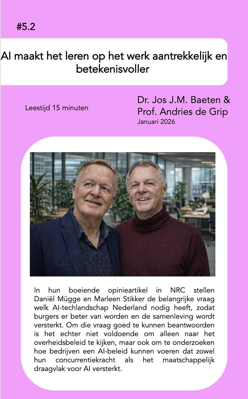 De paper AI maakt het leren op het werk aantrekkelijk en betekenisvoller laat zien waarom de maatschappelijke waarde van AI niet wordt bepaald door beleid of technologie alleen, maar juist op de werkvloer tot stand komt. Jos Baeten en Andries de Grip bouwen voort op het publieke debat over AI en laten zien dat organisaties een cruciale rol spelen in het creΓ«ren van draagvlak, productiviteit en betekenisvol werk door de manier waarop zij leren en werken organiseren .
