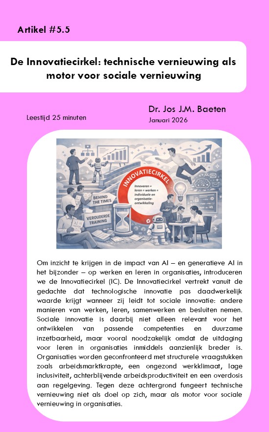 Technologische innovatie krijgt pas echte betekenis wanneer zij leidt tot sociale vernieuwing. In dit artikel introduceert Dr. Jos J.M. Baeten de Innovatiecirkel: een denkkader dat laat zien hoe leren, werken en innoveren onlosmakelijk met elkaar verbonden zijn.